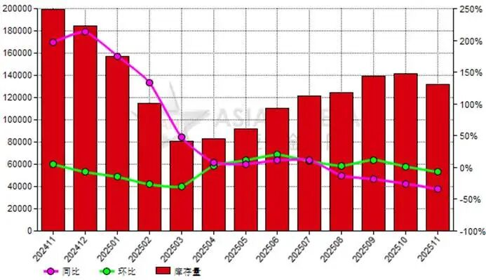 11月份中國(guó)鱗片石墨生產(chǎn)商庫(kù)存鱗片石墨為131,500.00公噸,去年同期為199,000.00公噸,上月為141,500.00公噸,同比減少33.92%,環(huán)比減少7.07%。