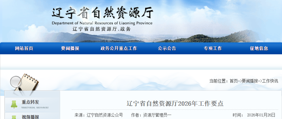 昨日,遼寧省自然資源廳發(fā)布2026年工作要點,將以習(xí)近平新時代中國特色社會主義思想為指導(dǎo),深入貫徹黨的二十大和二十屆歷次全會精神,全面落實中央和省委經(jīng)濟工作會議精神,統(tǒng)籌高質(zhì)量發(fā)展與高水平保護、高質(zhì)量發(fā)展與高水平安全,以服務(wù)和保障新時代遼寧全面振興為主線,切實履行"兩統(tǒng)一"職責(zé),全力做好"十五五"開局之年各項工作。