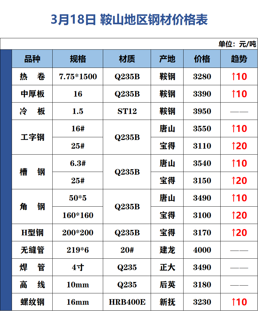 3月18日 鞍山地區(qū)鋼材價格表