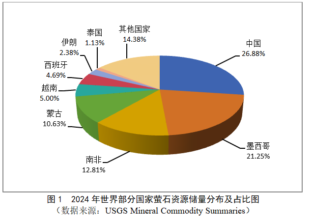 全球螢石資源分布不均,但資源分布格局相對(duì)穩(wěn)定,主要集中在中國、墨西哥、南非和蒙古,四國螢石儲(chǔ)量約占世界總儲(chǔ)量的70%。根據(jù)美國地質(zhì)調(diào)查局?jǐn)?shù)據(jù),截至2024年底,全球螢石儲(chǔ)量3.2億噸,其中中國螢石資源儲(chǔ)量居全球首位,約8600萬噸,占全球總儲(chǔ)量的26.8%;其次是墨西哥、南非和蒙古,儲(chǔ)量依次為6800萬噸、4100萬噸、3400萬噸。其他螢石資源儲(chǔ)量分布在北美州、亞洲東部、非洲南部等地區(qū)。