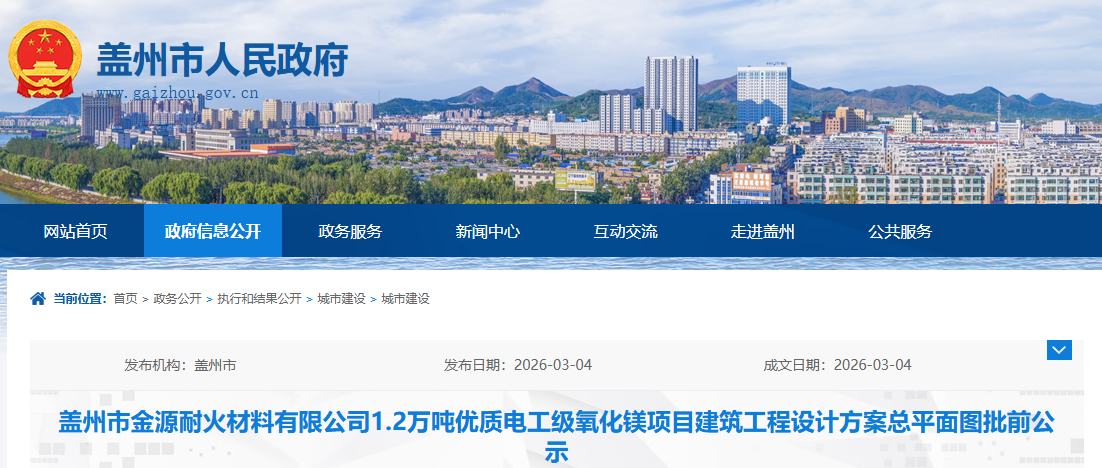 蓋州市金源耐火材料有限公司(2025年1月6日變更為蓋州市匯佳耐火材料有限公司)1.2萬噸優(yōu)質(zhì)電工級氧化鎂項(xiàng)目,規(guī)劃用地性質(zhì)為工業(yè)用地,項(xiàng)目用地面積為15942平方米?,F(xiàn)建設(shè)單位已委托設(shè)計(jì)單位按照相關(guān)技術(shù)標(biāo)準(zhǔn)和規(guī)范優(yōu)化完善了建設(shè)工程規(guī)劃設(shè)計(jì)方案,現(xiàn)將規(guī)劃設(shè)計(jì)方案予以公示并公開征求相關(guān)厲害關(guān)系人意見。