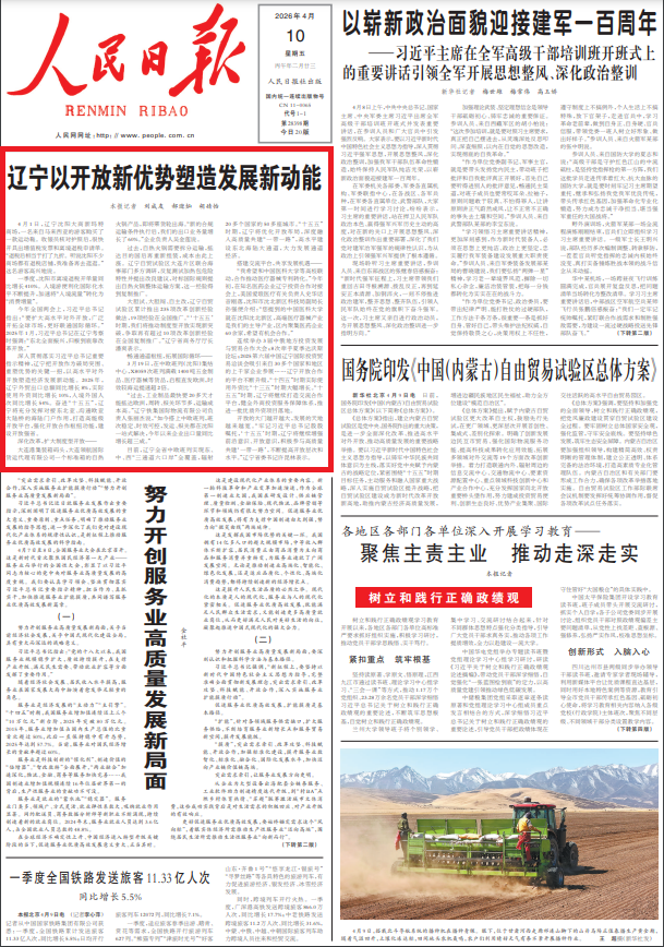 2026年4月10日,人民日報頭版頭條刊發(fā)《遼寧以開放新優(yōu)勢塑造發(fā)展新動能》,全文如下: