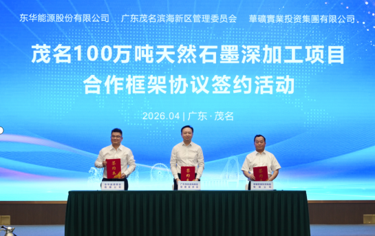 會上,廣東茂名濱海新區(qū)管理委員會、東華能源股份有限公司、華礦實業(yè)投資集團有限公司有關(guān)負責同志共同簽署《茂名100萬噸天然石墨深加工項目合作框架協(xié)議書》。