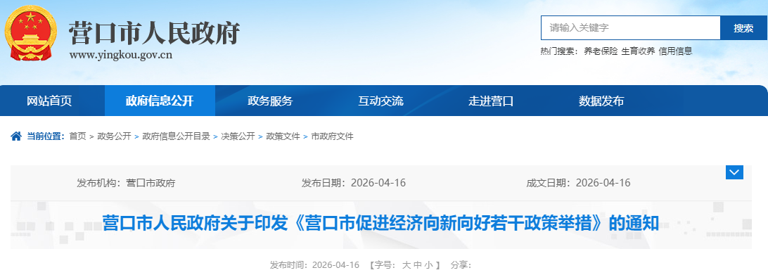 《營(yíng)口市促進(jìn)經(jīng)濟(jì)向新向好若干政策舉措》業(yè)經(jīng)2026年4月12日第十七屆市政府第106次常務(wù)會(huì)議審議通過,現(xiàn)予印發(fā),請(qǐng)認(rèn)真貫徹執(zhí)行。