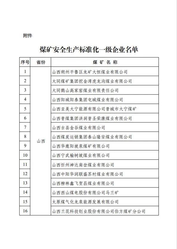 煤礦安全生產(chǎn)標(biāo)準(zhǔn)化一級(jí)企業(yè)名單的通知