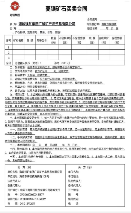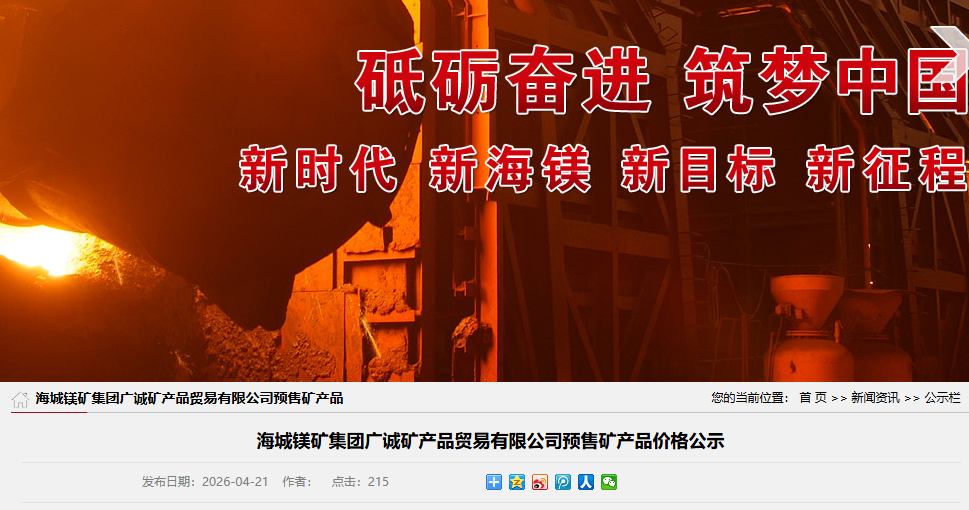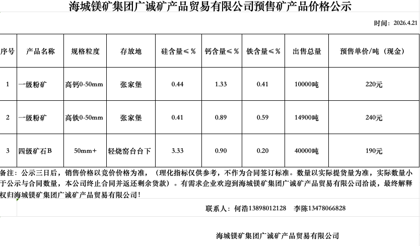 海城鎂礦集團(tuán)廣誠(chéng)礦產(chǎn)品貿(mào)易有限公司預(yù)售礦產(chǎn)品價(jià)格公示?