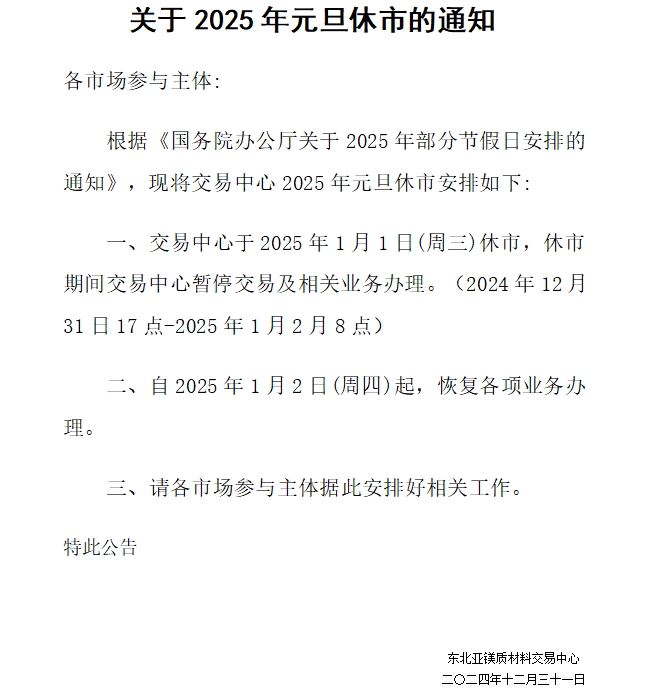 關(guān)于2025年元旦休市的通知
